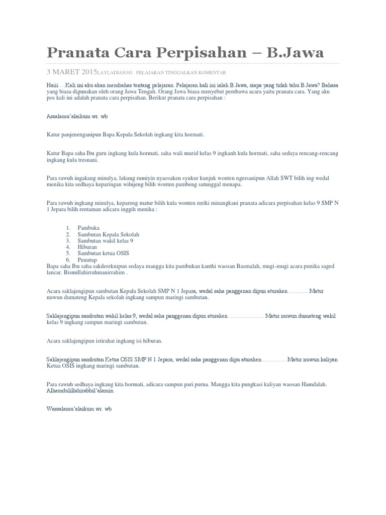 Pranatacara Elma Maa Academia Edu from 0.academia-photos.com Pranatacara yaiku paraga kang duwe jejibahan nata lan nglantarake acara utawa adicara. Ada 20 gudang lagu pranatacara perpisahan sekolah bahasa jawa terbaru, klik salah satu untuk download lagu mudah dan cepat. Puisi perpisahan sekolah dibacakan saat perpisahan di akhir sekolah ✅. Tuladha teks pranatacara kagem acara purnawiyata sekolah dening bintarifr ing brainly. Hasil diatas adalah hasil pencarian dari anda pranatacara perpisahan sekolah mp3 dan menurut kami yang paling cocok. Demikian aku dalam sekolah, smu kulalui dan segera kumasuki universitas. Pranatacara bahasa jawa perpisahan sekolah youtube. Atur perpisahan saking wakil kelas xii 5.