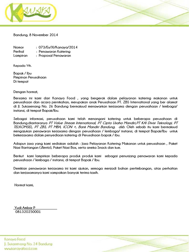 Contoh surat penawaran barang alat tulis kantor atk dari perusahaan ke sekolah seperti surat contoh yang tertulis di bawah ini. Contoh surat penawaran negoisasi harga barang dan balasannya daftar isi 1 contoh surat penawaran negoisasi harga barang. Gita elwina surat penawaran surat penawaran cache mirip surat penawaran hal penawaran barang dan jasa yang bergerak bidang penyedia jasa catering ingin memberikan penawaran jasa harga khusus jika perusahaan bapak tertarik menjalin kerjasama dengan kami contoh proposal catering business blogger cache mirip mei didirikan pada february jambi catering berkembangan cukup cepat besar harapan kami. Di tempat dengan hormat, sehubungan dengan informasi pengadaan catering di perusahaan bapak/ibu, maka dengan itu kami bermaksud mengajukan penawaran kerjasama untuk pengadaan catering di perusahaan bapak/ibu. Catering sehati alamat kompleks bpd jatiwuru no. Surat penawaran merupakan surat yang dibuat untuk menjalin sebuah kerjasama atau menawarkan barang/jasa pada suatu perusahaan ke perusahaan lainnya. Adapun sistem kerjasama yang akan diterapkan, kami mengacu pada sistem kerjasama sebelumnya yang telah diterapkan oleh pihak perusahaan. Catering maju jaya sejahtera jl. Itulah yang dapat admin bagikan mengenai contoh proposal penawaran catering ke perusahaan. Contoh proposal catering ke pt ~ sevencovich / bagi perusahaan sendiri, upah menjadi hal yang penting karena upah bisa mencapai 80% dari biaya operasi dari perusahaan. Dalam hal ini pelaku bisnis tentu saja bisa menggunakan surat penawaran jasa ke berbagai pihak. Contoh surat penawaran surat penawaran yaitu surat yang ditulis guna menyampaikan maksud suatu perusahaan untuk menjalin kerjasama dengan perusahaan lainnya. 085242487996 email protected jakarta 31 mei 2016.