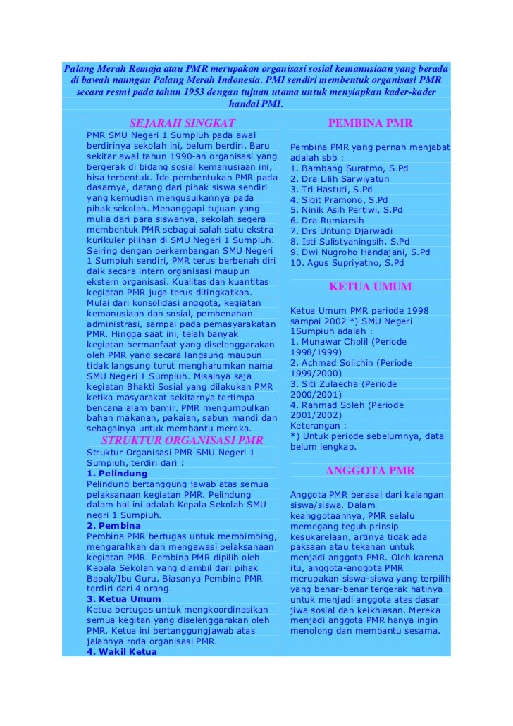 Uh1 B Indonesia Kelas V from data03.123doks.com Pmi selalu mempunyai tujuh prinsip dasar gerakan internasional palang merah dan bulan sabit merah yaitu kemanusiaan, kesamaan, kesukarelaan, kemandirian, kesatuan, kenetralan, dan kesemestaan. Pmr digantikan dengan pt3 bermula dari 2015. Penilaian menengah rendah (pmr) (dilaksanakan mulai 1993) Ini akan membuat kamu memiliki lebih banyak teman dan bisa berkenalan dengan teman—teman baru. Assalamualaikum salam palang merah remaja. Juni 2008 hak cipta âš palang mer ah indonesia. Penilaian menengah rendah atau dikenali dengan singkatannya pmr, merupakan satu peperiksaan kebangsaan di malaysia yang ditadbir secara berpusat dengan unsur penilaian kerja kursus di peringkat menengah rendah. Motivasi menjadi anggota pmr apa saja ?
